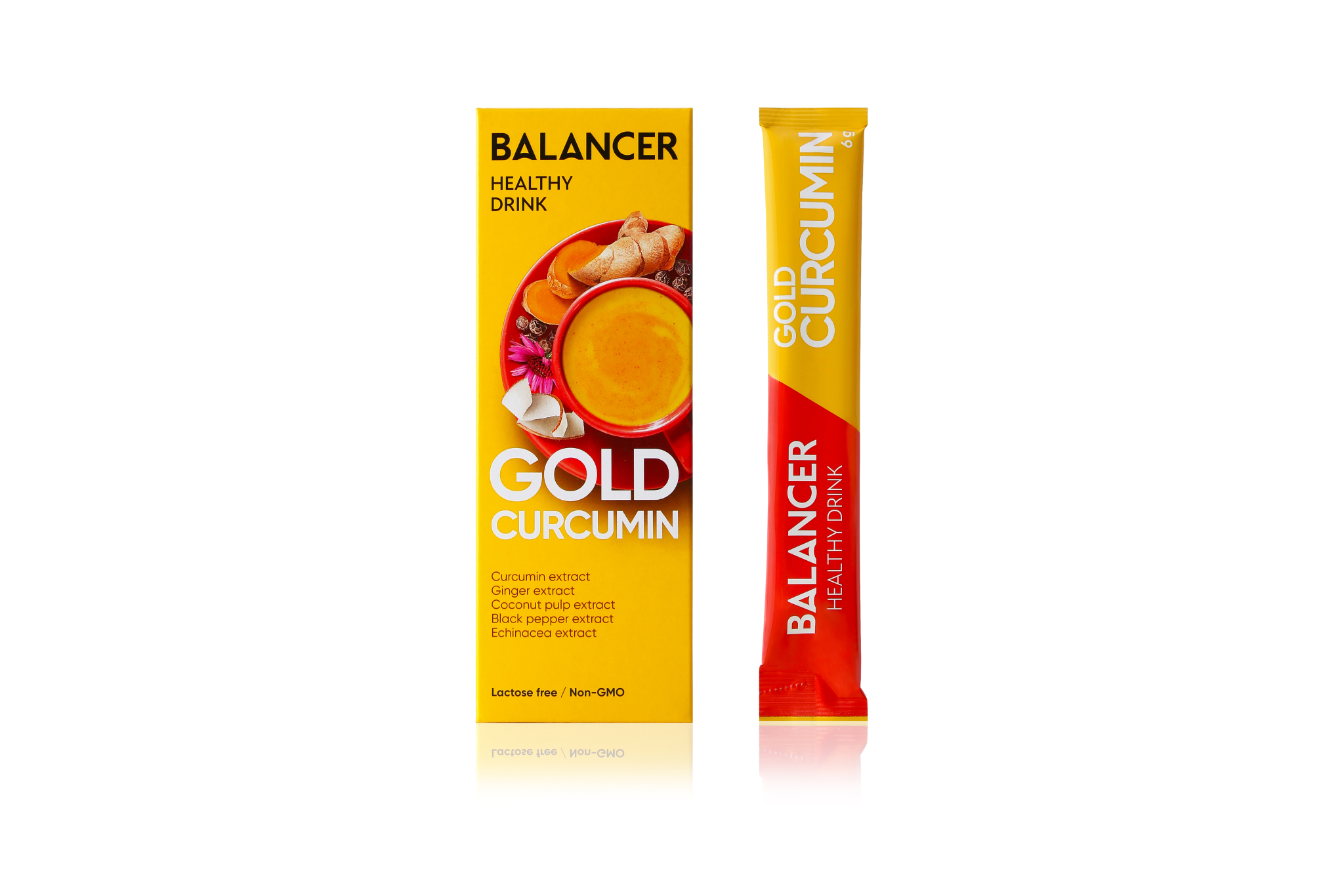 BALANCER GOLD CURCUMIN — оригинальный согревающий и общеукрепляющий напиток на кокосовом молоке с куркумой, имбирем и черным перцем. Каждая порция содержит 50 мг куркумина, который хорошо усваивается организмом. Насладитесь уникальным вкусом с пользой для здоровья!